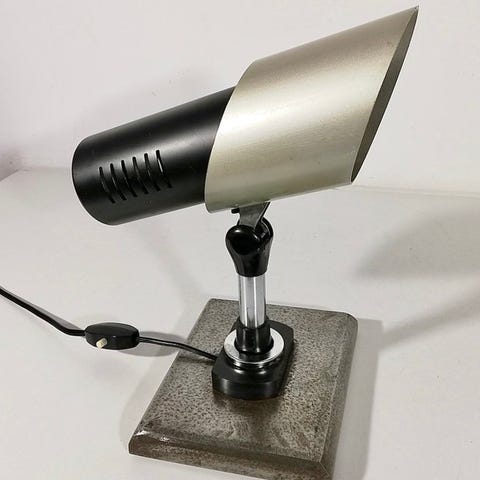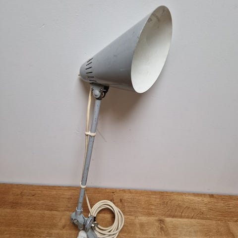 En metalskrivebordslampe i midcentury modern stil fra Holland, i pæn vintage stand med små tegn på alder og i funktion, dybde 40 cm, bredde 30 cm, højde 50 cm. Klik på den blå "gå til varen" knap, for at købe eller byde på denne vare. Den samlede pris vil blive vist inden du afgiver dit bud.