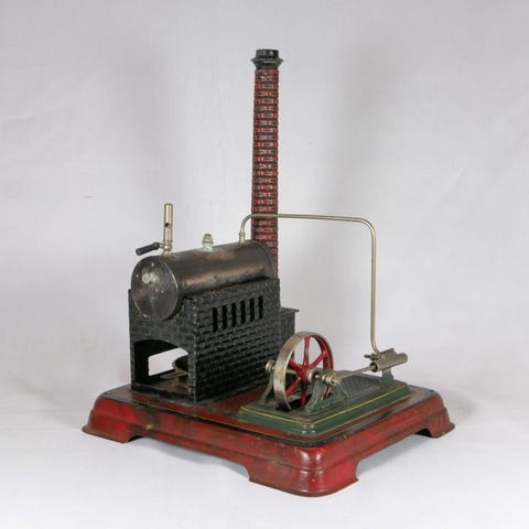 Mamod SE3 To-kavlet dampmaskine, ca. 1960, i messing og metal, vægt 1320 g, dimensioner 26 x 23,5 x 17 cm, i rimelig stand med mulig manglende dele og små buler. Klik på den blå "gå til varen" knap, for at købe eller byde på denne vare. Den samlede pris vil blive vist inden du afgiver dit bud.