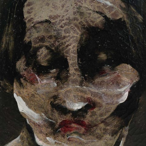 Kunstneren udforsker forholdet mellem krop og følelser gennem en varm og kontrastfuld palet, der fremhæver hudens tekstur og blikkets lysstyrke med stor teknisk præcision.