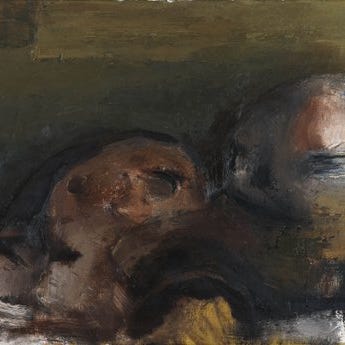 Dit maleri viser to figurer ved et bord, gengivet i en stilfærdig, introspektiv stemning. Konturerne er uklare og bløde, hvilket får fremstillingen til at ligge mellem figurativitet og abstraktion. Den venstre figur —