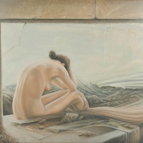 I dette farverige maleri fanger Hess varmen og livligheden i et sommerlandskab i fuldt flor. I forgrunden står en kvindelig figur, badet i sollys, hvis udtryksfulde portræt er opbygget af kraftige penselstrøg i varme orange og rustfarver. Bag hende strækker et stort lavendelmark sig ud, malet i en rig palet af lilla, blå og grøn, hvilket afslører Hess’ karakteristiske dynamik i penselstrøget. De tykke, løse penselstrøg
