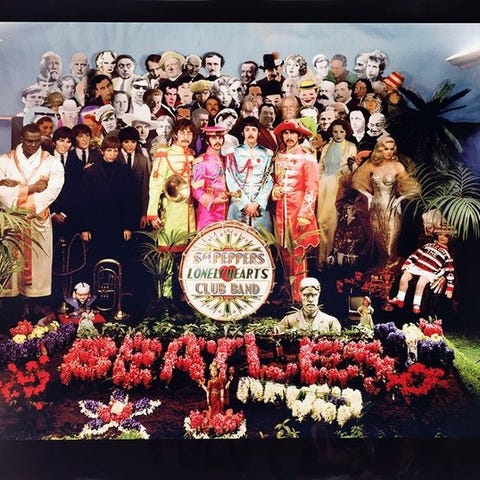 Collage lavet af Michael Cooper, sandsynligvis i samarbejde med eller inspireret af Peter Blake. På collaget ser vi under ære Jennifer Boyd (Pattie Boyds søster), The Beatles, Tom Jones, Bob Dylan, The Rolling Stones.