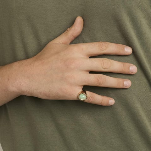 Den livlige farve af agat kontrasterer harmonisk med den varme glans af guld, hvilket giver ringen en iøjnefaldende og tidløs karakter.