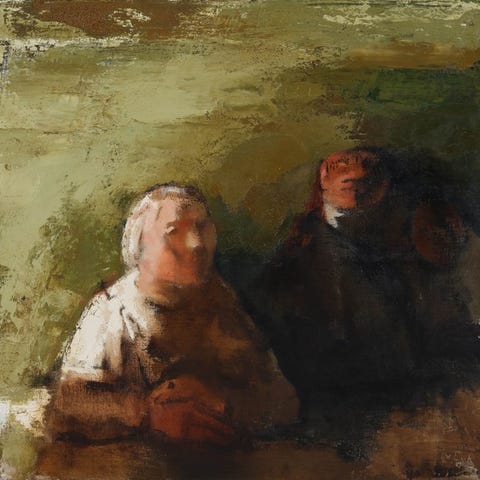 I dette værk viser Van Eyk sin karakteristiske udtryksfuldhed. To figurer — halvt synlige, halvt udviskede — synes at dukke op fra en mørk, jordnær baggrund. Penselstrøgene er grove, med tykke, ru lag af maling, der skaber en