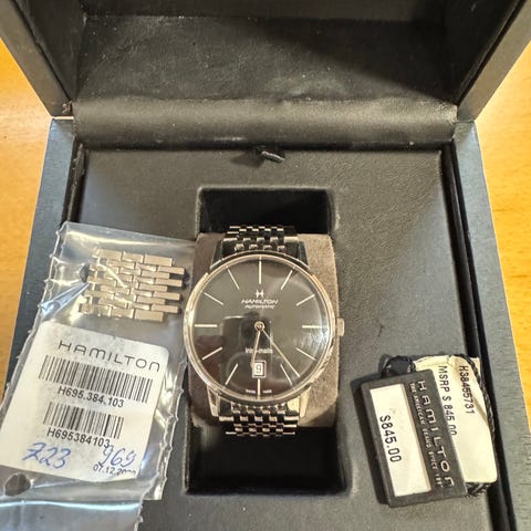 Hamilton Intra-Matic reference H38735501, 42 mm stål-kasse, brun skive, automatisk urværk, brunt læderbånd, ny med original æske, papirer og garanti. Klik på den blå "gå til varen" knap, for at købe eller byde på denne vare. Den samlede pris vil blive vist inden du afgiver dit bud.