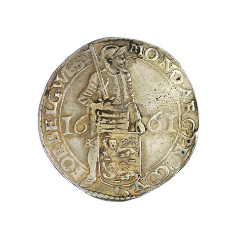 Bagside: Kronede våbenskjold for De Forenede Provinser; møntmærke: Utrechts byvåben. Legende: "CONCORDIA.RES.PARVAE.CRESCVNT." ("Enhed får små ting til at vokse").