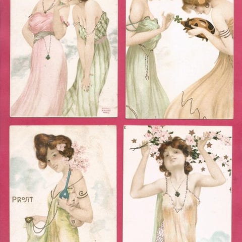 Raphael Kirchner, Art Nouveau komplette serie på fire stykker, dateret 1900, i meget god stand. Klik på den blå "gå til varen" knap, for at købe eller byde på denne vare. Den samlede pris vil blive vist inden du afgiver dit bud.