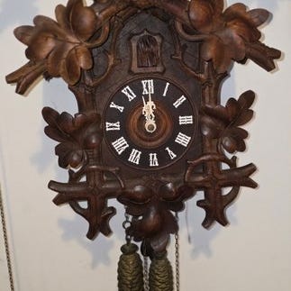 Smuk farvet koekoekur med jagtfresko. På toppen af uret sidder en strålende fjerkam med håndskåret hjortehoved med glasøjne.