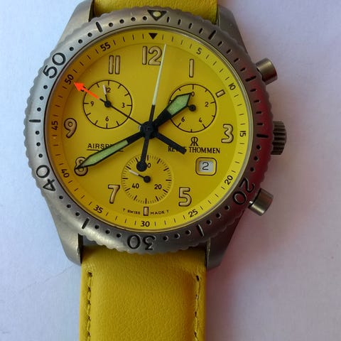 Skive: sort. Kalender kl. 3. Lysstærke indeks. Lysstærke visere. Central sekundviser.
