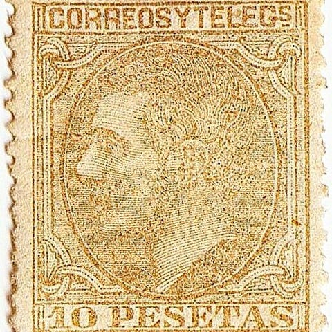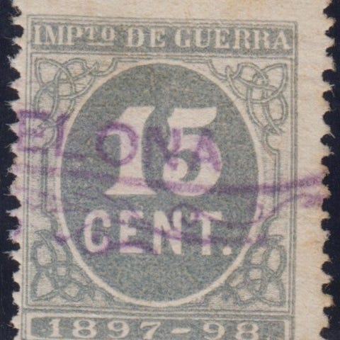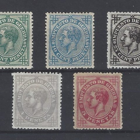 Spanien, 5 pesetas nyt krigsafgift-stempel, Edifil 128, udgivet i 1876, stand MNG (nyt uden klæbemiddel). Klik på den blå "gå til varen" knap, for at købe eller byde på denne vare. Den samlede pris vil blive vist inden du afgiver dit bud.