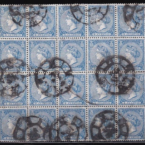 Spanien, Isabel II – Edifil 44 – Blok 24 – med Parrilla Negra poststempelvarianter. Klik på den blå "gå til varen" knap, for at købe eller byde på denne vare. Den samlede pris vil blive vist inden du afgiver dit bud.