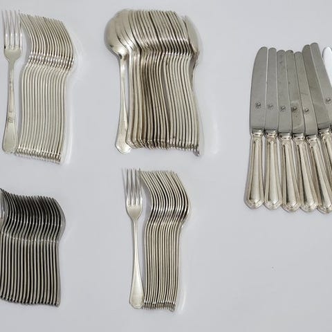 Hele servicen er indpakket efter kategori i særlige blå fløjlsposer med et bånd, der lukkes med navnet på indholdet.
