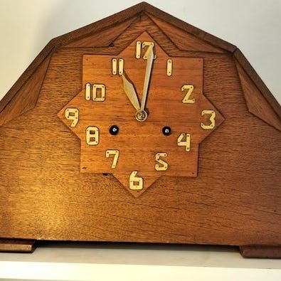 Art Deco pendul ur ur dateret fra 1920erne–1930 erne, fremstillet af egetræ og messing. Klik på den blå "gå til varen" knap, for at købe eller byde på denne vare. Den samlede pris vil blive vist inden du afgiver dit bud.