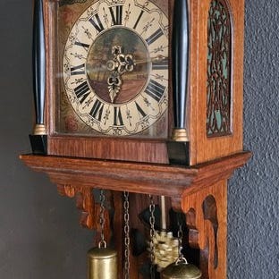 Antikt frisisk stolur fra 1950–1960 med mekanisk urværk, månefase, to kobbervægte mærket JWA og blyornamenter, fremstillet i træ, messing og kobber, 48 cm høj, 27 cm bred, 16 cm dyb, vægt 8 kg, oprindelse Nederlandene. Klik på den blå "gå til varen" knap, for at købe eller byde på denne vare. Den samlede pris vil blive vist inden du afgiver dit bud.
