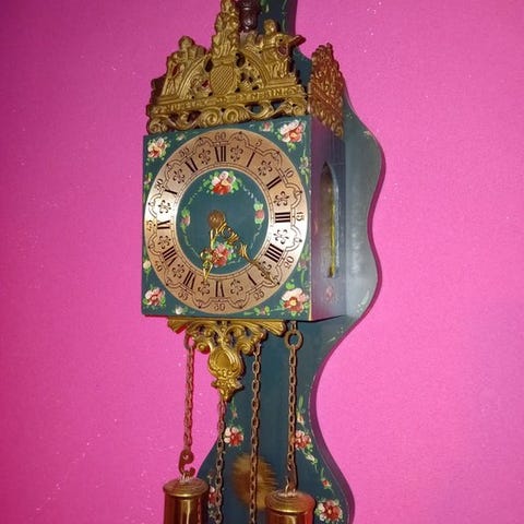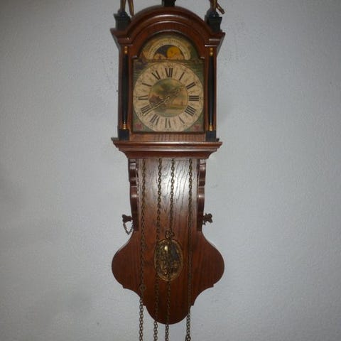 Fungerende frisisk haleur med originale kobbervægte. Smuk urskive med romerske tal. Drejeskive med sol og måne.