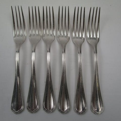 8 elegante frugtgaffler fra Christofle, model Spatours, i sølvfarvet metal, i næsten ny stand.