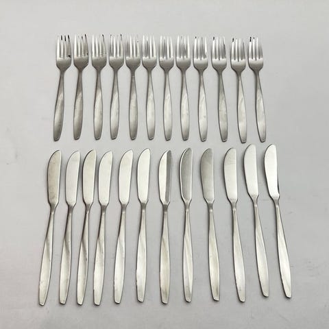 WMF - Forsølvet metal, Tyskland omkring 1900, gaffel hver 17,8 cm lang eller kniv hver 19,6 cm lang, ca. 760 g samlet vægt.