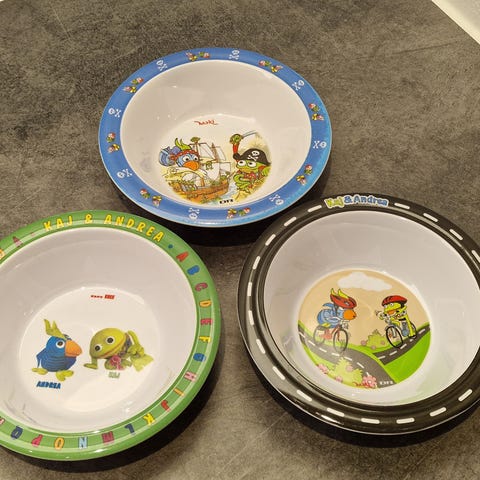 3 stk Kaj & Andrea tallerkner. 2 flade og en dyb. I flot stand. Kommer fra røg- og dyrefrit hjem.