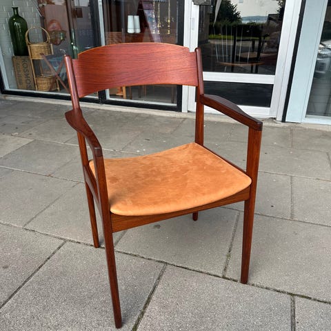 Armstol 1960 erne i teak ombetrukket med brunt uldstof..