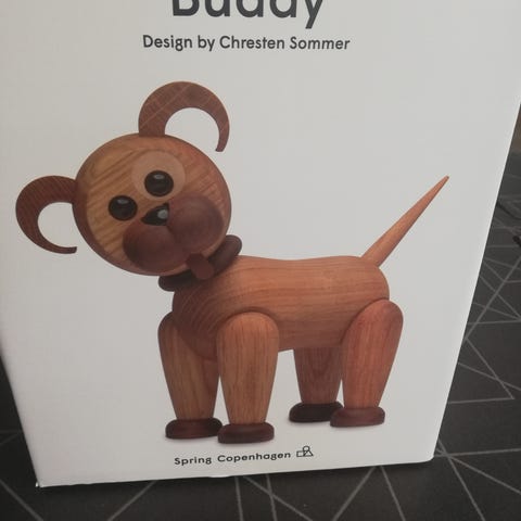 Spring Copenhagen Happy træfigur i træ, designet af Christian Thomsen. Figuren forestiller en hund og er lavet i træmateriale.
