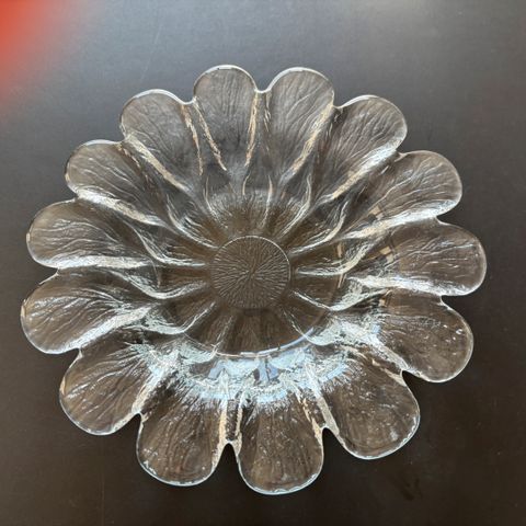 Holmegaard glasfad blomst med dekorative udskæringer, transparent glas.