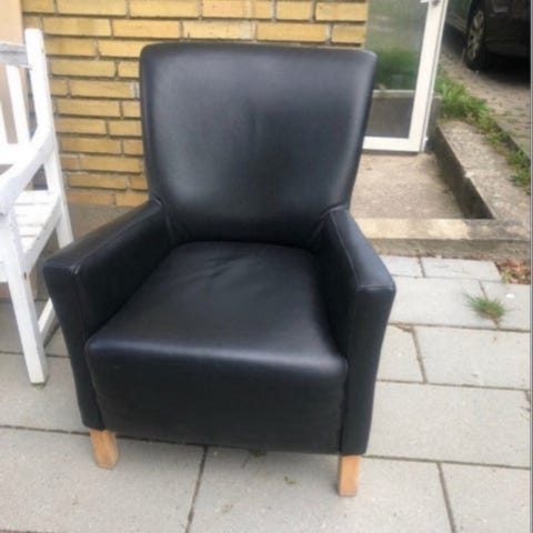 Super lækker lænestol i sort okselæder designet af Van den Berg (Label Longa). Der medfølger skammel. Har patina og trænger til læderfedt - derfor den lave pris.