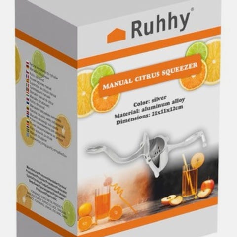 Citruspressen er 17 centimeter bred, 20,5 centimeter lang og 26,5 centimeter høj. Fremstillet af plast, rustfrit stål og silikone.