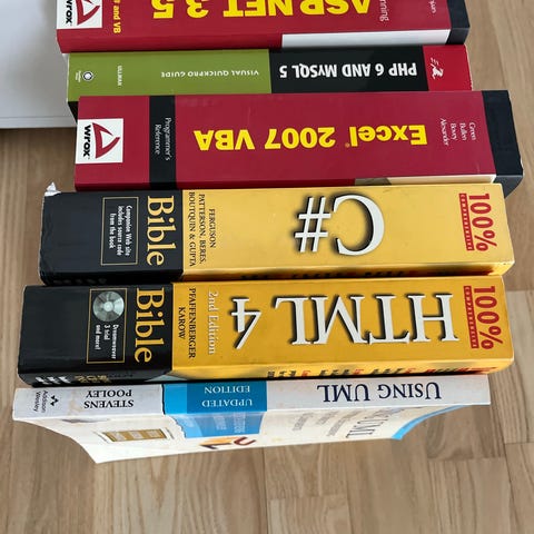 Basic Det Enkle Programmerings Sprog bog med blå omslag. Indeholder grundlæggende information om programmeringssprog, inklusive kapitler om data, serier og løkker. Bogens indhold dækker emner som input/output, programmeringsstrukturer, kontrolstrukturer og fejlfinding.