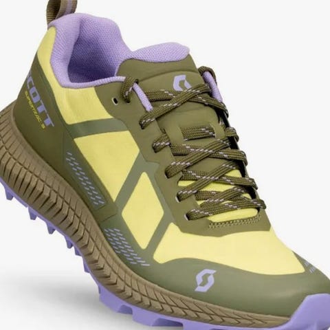Disse løbesko er designet til trail running og har en solid sål, der giver godt greb på ujævne overflader. Skoene er grå med grønne detaljer og har en snørelukning. Indersiden er foret med mesh for komfort og åndbarhed. Skoene har Gore-Tex teknologi, hvilket gør dem vandafvisende og ideelle til forskellige vejrforhold. Bagsiden viser et symbol af en fod på en vægt, hvilket kan indikere en speciel teknologi eller design i sålen. Størrelsen på skoene er 38.