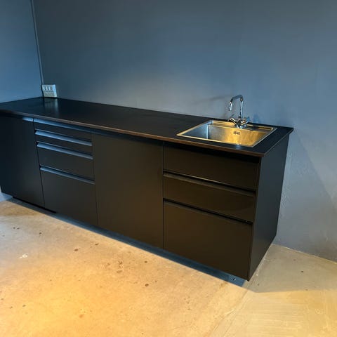 Komplet IKEA køkken med indbygget køleskab, ovn, kogeplade, emhætte og træbordplade.