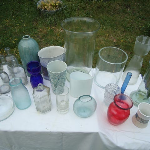 Sæt med farvede glasvaser i stativ fra Det Gamle Apotek (str. 11x27x8 cm)