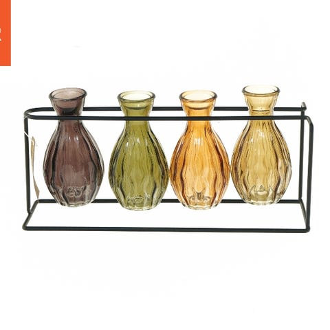 Dette er et sæt med fire glasvaser i forskellige farver, placeret i et sort metalstativ. Vaserne har en bølget tekstur og kommer i farverne brun, grøn, orange og gul, hvilket giver en smuk visuel effekt. Hver vase er formgivet med åbning i toppen, ideelt til små blomsterarrangementer eller som dekorative elementer. Stativet sikrer, at vaserne står sikkert og stabilt. Størrelsen af hele enheden er 11x27x8 cm.