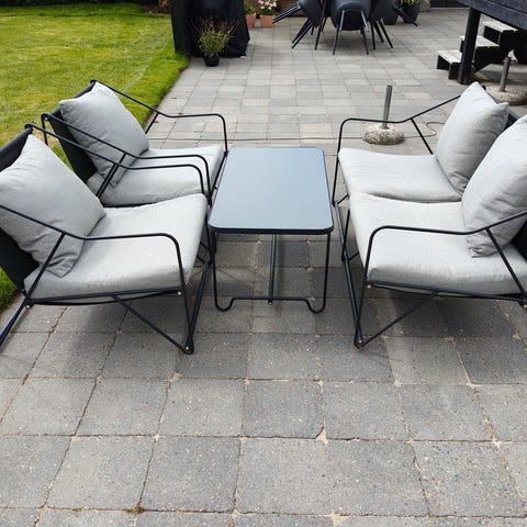 Havemøbelsæt Henderson fra Ilva bestående af en sofa i rattan med hynder i blå og hvid stribet stof. Sættet er velegnet til udendørs brug og har et bord med rund beton bordplade og træben. Hynderne trænger til nyt stof. Ny pris 4700 kr