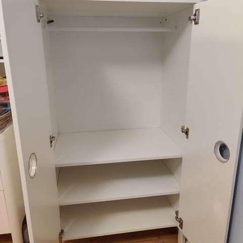 Klædeskab med bøjlestang, men uden hylder. Mange tilkøbsmuligheder hos Ikea der kan tilføre hyldeplads hvis ønsket. F.eks. STUK eller SKUB hængende hyldesektioner. Se link nedenfor til skab og tilbehør.
