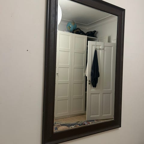 Spejlet er 60 cm bredt og 90 cm højt og malet i en grøn farve.