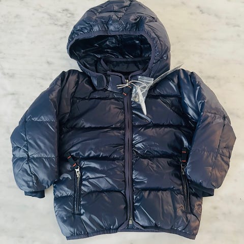Meget flot dunjakke fra Ver det terre, 12 måneder (stor i størrelsen), meget blød og varm med pelsekrave. Brugt meget lidt, næsten som ny.