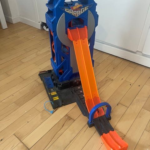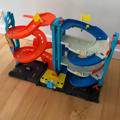 Hot Wheels bilbane – brugt. Trænger til en god rengøring og skal samles/bygges op igen. Alle etager følger med, samt en lang bilbane fra garagen og ned. Der medfølger også en krokodille, men den fungerer ikke optimalt, og nedkørslen er heller ikke helt i topform.