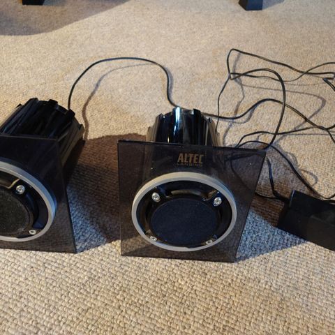 Computerhøjttalere, Fujitzu Siemens, Højttalerne har indbygget forstærker med mulighed for at tilslutte hovedtelefoner og med volumenregulering. Virker fint. Måler 13 x 10 cm og 18 cm i højden.