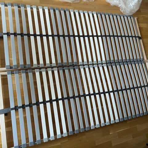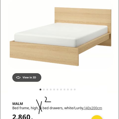 IKEA bed frame (Neiden including 2 x slatted floor, link: https://www.ikea.com/dk/da/p/neiden-sengestel-fyr-luroey-s39248608/) and accompanying mattress (Åbygda, link: https://www.ikea.com/dk/da/p/abygda-skummadras-fast-hvid-00481462/) for sale. Bought in 2023, receipt still available. Selling to create more space. No animal and no smoking household.