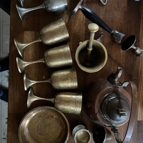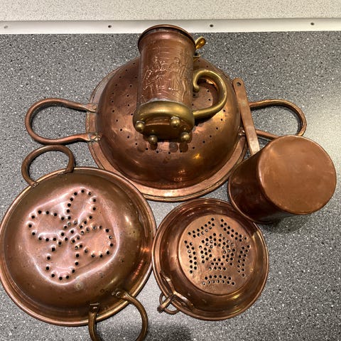 Sæt af køkkenredskaber i kobber bestående af et dørslag, pande, tragt og kedel. Materialet er kobber, og redskaberne har en klassisk og rustik stil.