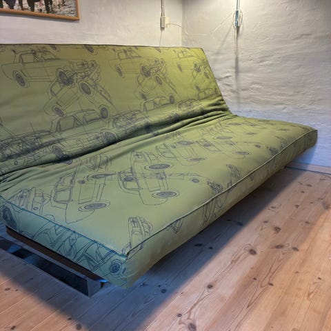 KAN AFHENTES GRATIS Sovesofa med futon madras fra Innovation kan afhentes gratis, I skal være to til at bære. Betrækket er misfarvet fra solen (kan lynes af hvis man vil forsøge sig med at farve det), udover det fejler den absolut intet.