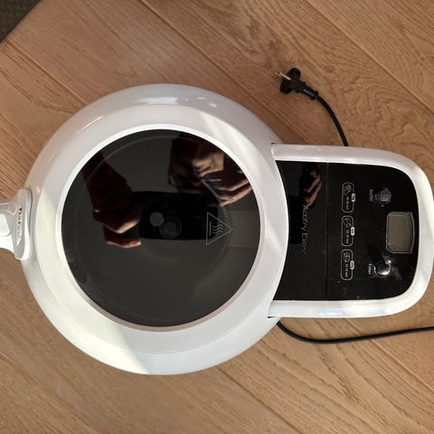 Køkkenapparat til stegning med minimal olie. Indeholder digitalt kontrolpanel med forskellige forudindstillede programmer.
