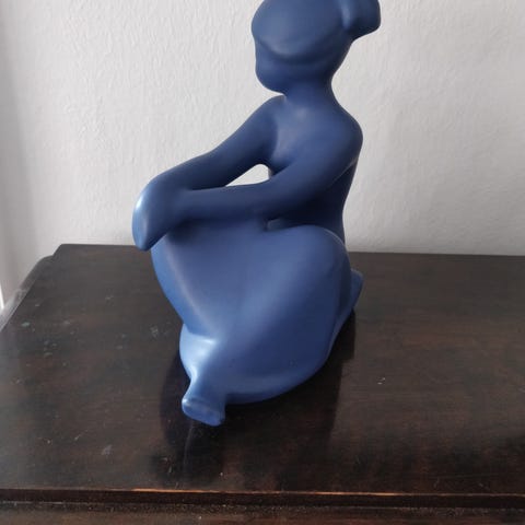 Dette er en porcelænsfigur, der forestiller en havfrue siddende på en klippe. Figuren måler 6,5 cm i højden og har en glat finish. Havfruen har et klassisk design med en fiskehale og bølget hår, og sidder i en hvilende position. Farven på figuren er en blanding af hvid og blå nuancer.