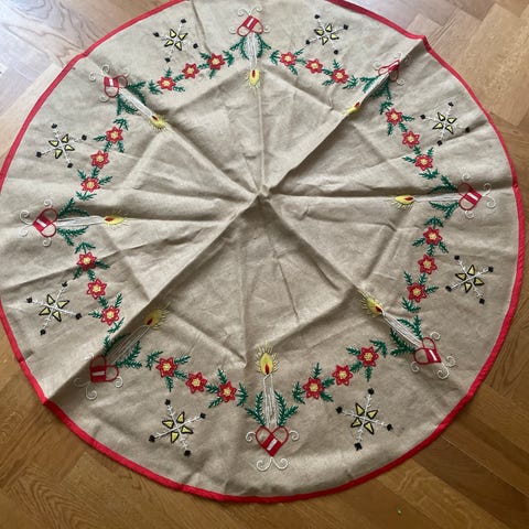 Rund malet Juletræstæppe, med malet nisse motiv. Plast på undersiden.