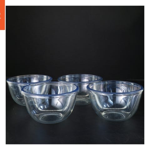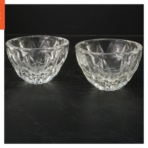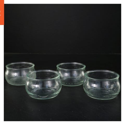 Seks klare glas skåle med en forhøjet base. Skålene er lavet af glas og har et enkelt og stilrent design. De er ideelle til servering af dessert eller snacks og hver måler 9x9 cm.