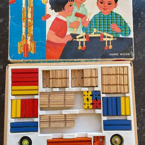 Ældre konstruktionssæt i træ sælges. Leveres i original æske og med den originale vejledning, som viser forskellige modeller man kan bygge.
