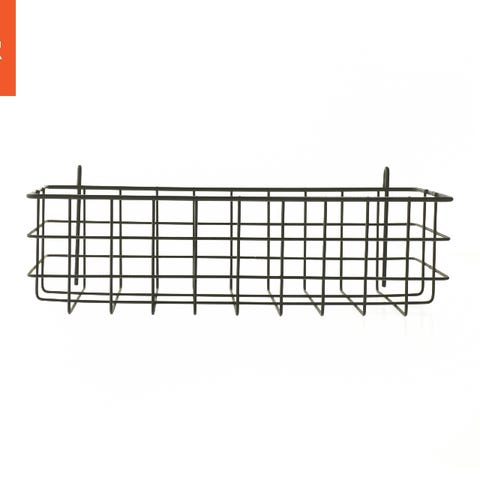 En dekorativ kurv lavet af metaltråd med en bund af træ. Kurven har et sort skilt med teksten 'GOOD STUFF' monteret ovenpå. Den måler 24x21 cm, og kan bruges til opbevaring af diverse småting og til at give et moderne touch til rummet.