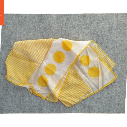 Dette er et tørklæde med en længde på 135 cm og bredde på 28,5 cm. Tørklædet har et grafisk design med horisontale striber i orange, hvid og mørkeblå. Det er lavet af let stof, der er behageligt mod huden og kan bæres som tilbehør til forskellige outfits. Der er en mærkat med vaskeanvisning og brandnavn fastgjort på tørklædet. Tags: tørklæde, striber, orange, blå, tilbehør