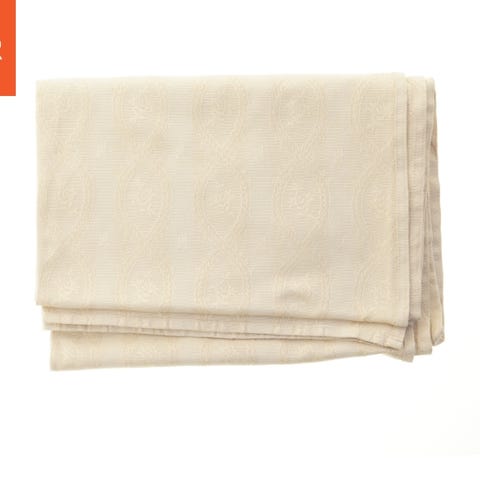 En hvid dug med et dekorativt mønster i gul langs kanten. Den måler 106x106 cm og har et firkantet design, der passer til mange bordtyper. Egnet til brug i hjemmet for at tilføje et klassisk touch til spiseområdet.