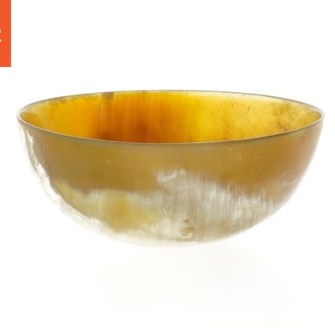 Denne skål er lavet i hornmateriale og har en let bølget kant. Den har en gylden brun farve og fremstår glat overflade. Skålen har dimensionerne 4x12 cm, hvilket gør den praktisk til små-genstande eller som dekoration.